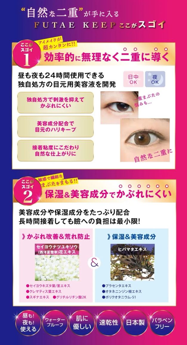 寝ている間にふたえメイクの癖づけをサポート。就寝中も使える美容液タイプで理想の目元作りをお手伝い。美肌エッセンス・保湿成分配合でまぶたをやさしくケアしながら、メイクアップ効果でふたえラインを演出。昼夜問わず24時間使用可能。速乾性で使いやすい二重まぶた化粧品。
